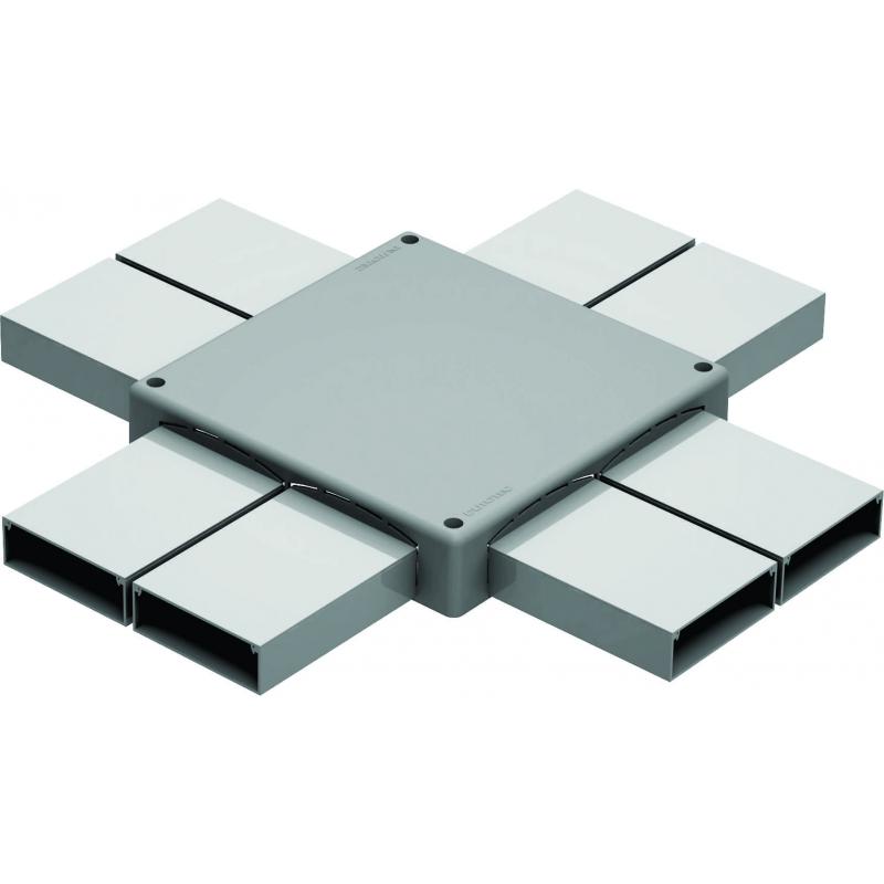 As caixas de derivação possuem um tucho central para passagem do cabo em paralelo ou perpendicular a entrada de cabos ( modelo 1x1). Blindagem eletromagnética fabricada em alumínio para garantir a compatibilidade eletromagnética dos cruzamentos perpendiculares. Tampões de arremate escondem os parafusos de fixação e são presos à caixa, impedindo que sejam perdidos.