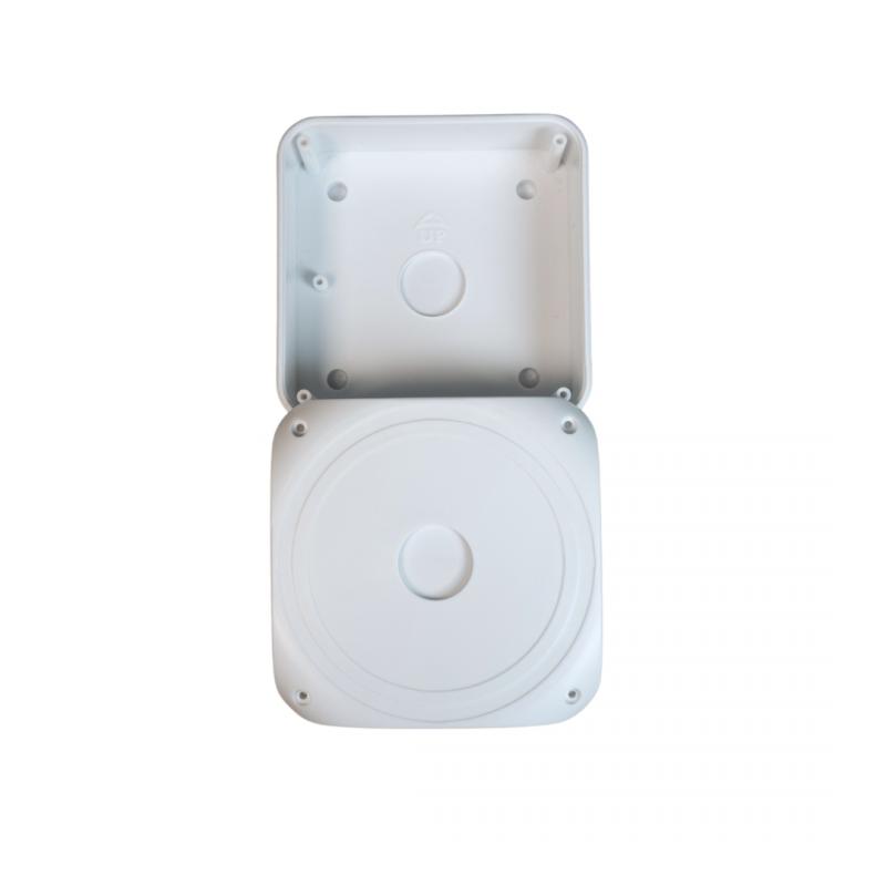 Caixa de Passagem para acomodação de cabos de sistemas de segurança eletrônica, ideal para instalação de câmera de CFTV. O produto possui uma entrada na tampa, permitindo a fixação de câmera com uso de parafuso auto atarraxante.