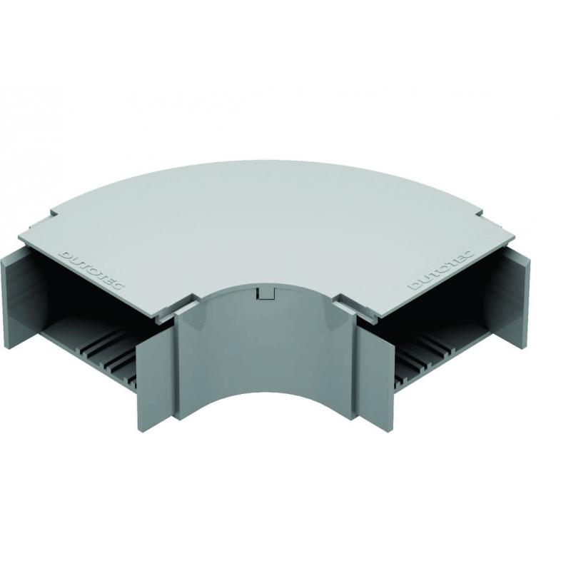 Fabricadas em alumínio injetado sob pressão. Compostas de base e tampa. Acabamento das tampas iguais às tampas das canaletas tornando a instalação mais requintada. A conexão da tampa com a base da curva se dá sob pressão. Para configurar internamente a curva é necessário a colocação dos septos móveis.(Vendidos separadamente em conjunto com 3 unidades). Este modelo de curva garante uma curvatura em torno de 8, vezes o diâmetro de um cabo de telecomunicações. Embalagem:10 peças