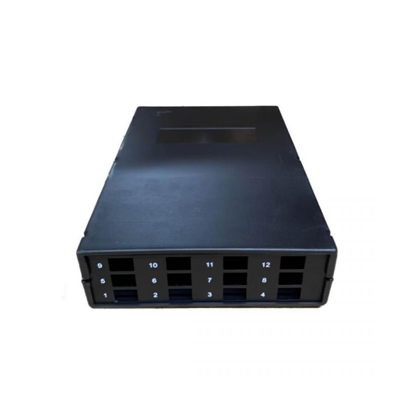 Disponível em versões para 12 acopladores SC, 6 acopladores LC Duplex ou splitters até 1x8, requer aquisição separada de pig tails, acopladores e protetores de emenda. Inclui manual de montagem e embalagem individual com solapa, sendo de cor preta para integração estética em diversos ambientes de rede.