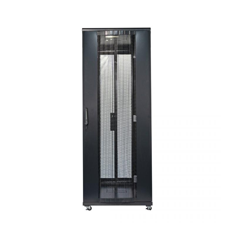 Estrutura robusta com fechamento elegante, fechadura nas portas e carga estática de 800 kg. Fabricado em aço SPCC de alta qualidade, com espessuras de 2mm, 1,5mm e 1,2mm, e pintura epóxi microtexturizada RAL 9004. Inclui aterramento, pés niveladores e kit rodízio. Dimensões: 44U de altura útil (2140 mm de altura externa c/ rodizio), 600mm de largura e 1100mm de profundidade.